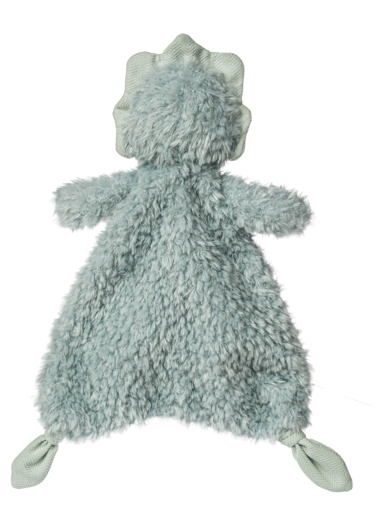 SOFT TOY LOVEY: Dinosaur is a comforting cuddle toy with an under-stuffed body in textured blue fabric with knotted corners at the feet; lovey has a soft sculpted face with embroidered eyes